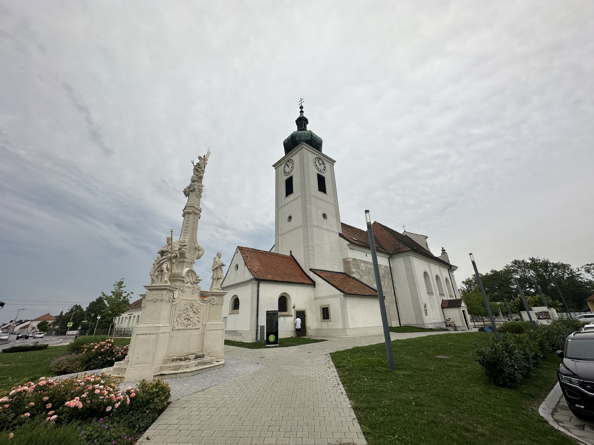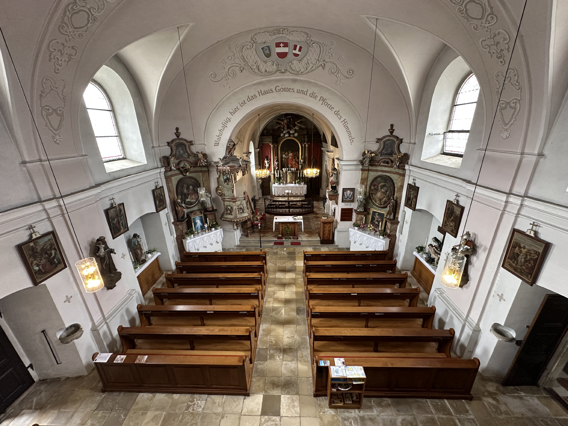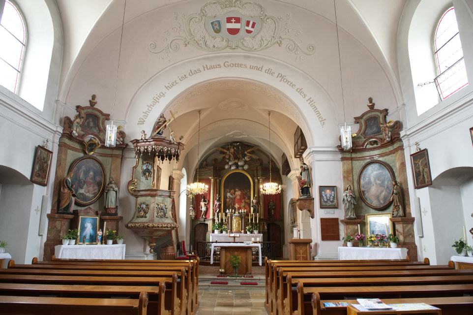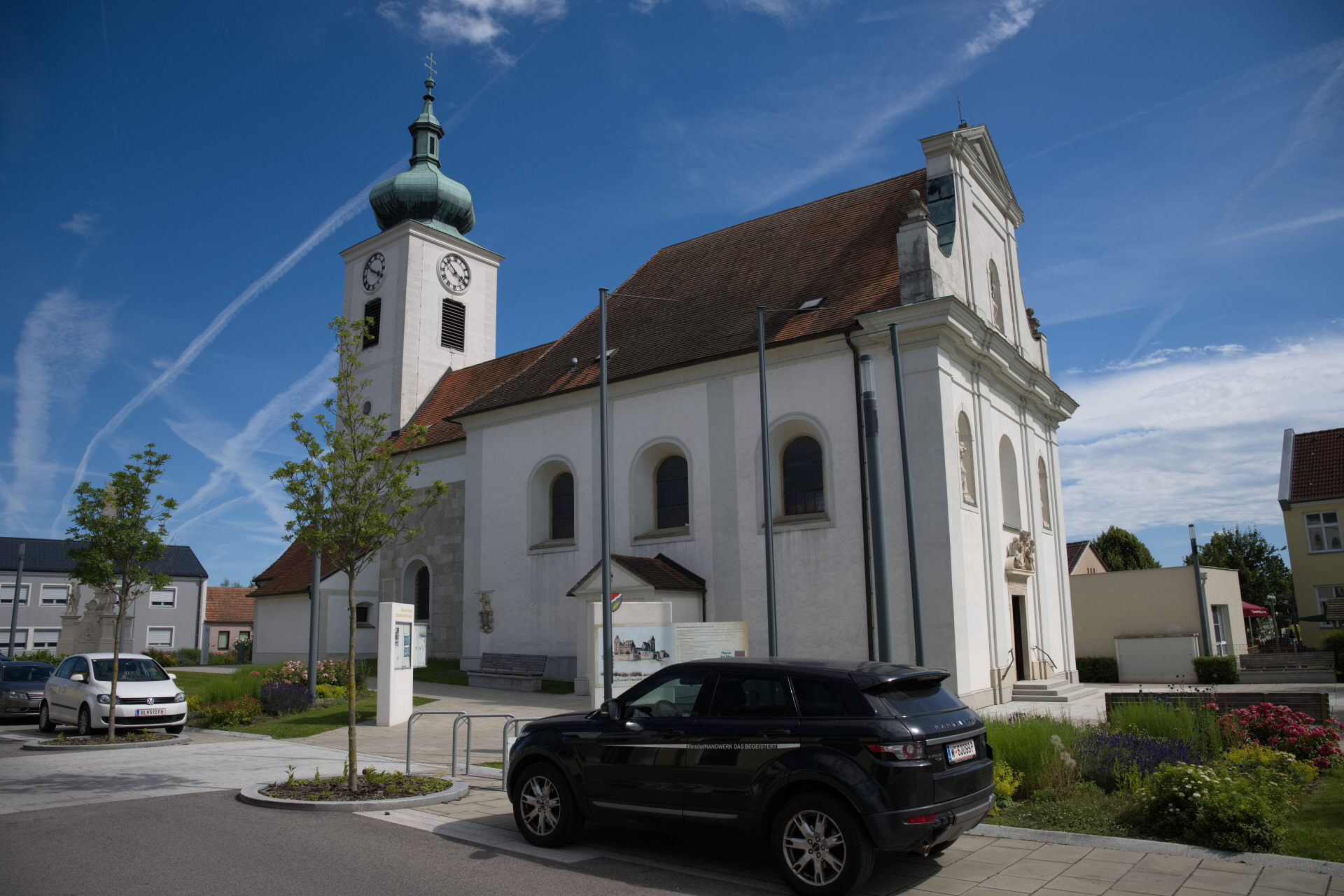 Die Kirche hat eine beeindruckende barocke Fassade mit großen Rundbogenfenstern und einem verzierten Traufgesims. Die Westseite des Gebäudes ist durch flache Pfeiler gegliedert und wird von einem dreieckigen Giebel gekrönt. Über dem Eingang befindet sich eine Inschrift aus dem Jahr 1715. In Nischen stehen drei Statuen. Besonders auffällig ist der hohe Kirchturm mit einem Zwiebelhelm und einer Laterne (Turmaufsatz). 1930 wurden - wie es in der Chronik heißt - Kirche, Pfarrhof und die Filialkirche ordentlich „hergerichtet„. An der Nordseite des Turmes ist die ältere Sakristei angebaut, während an der Südseite eine gotische Kapelle aus dem 14. Jahrhundert mit gestützten Mauern und Spitzbogenfenstern zu sehen ist.
